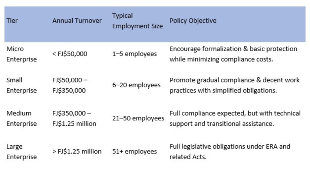 Fiji already applies proportional obligations and incentives in the Companies Act 2015, H&S At Work Act 1996 and Income Tax Act 2015 which sets a precedent for a tiered approach under the Employment Relations Act 2007.